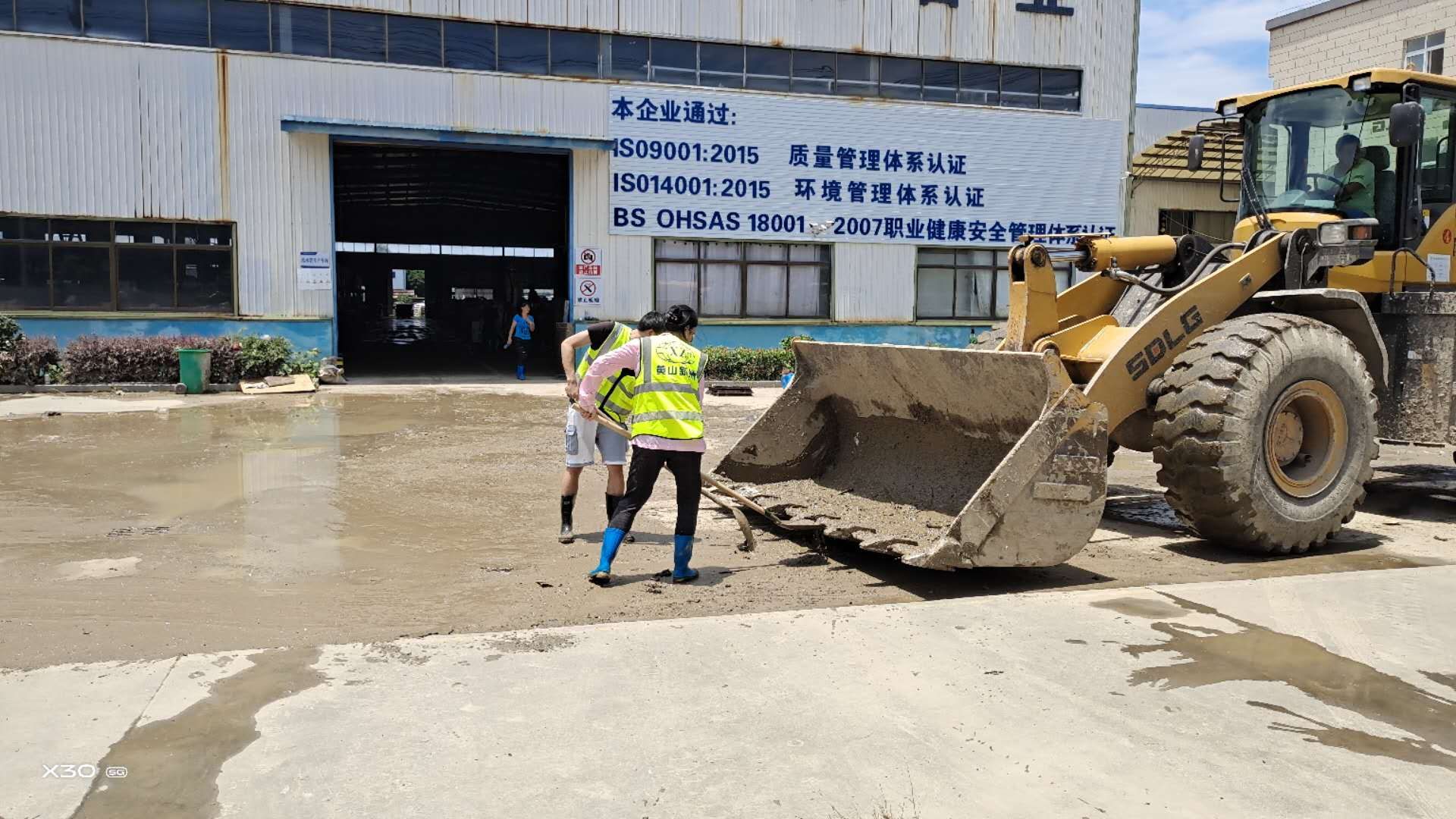 上午8時(shí)許,黃山新洲公司黨員、入黨積極分子、抗洪搶險(xiǎn)志愿者開著鏟車、灑水車從屯溪區(qū)出發(fā)到達(dá)歙縣經(jīng)開區(qū)受澇嚴(yán)重的黃山順濤管業(yè)有限公司進(jìn)行衛(wèi)生清掃,先清理垃圾及淤泥,再進(jìn)行集中消毒消殺。烈日炎炎,新洲支部的黨員志愿者們個(gè)個(gè)不怕臟,不怕累,頂著烈日,揮汗如雨。通過一個(gè)上午的勞動(dòng),在人機(jī)配合下,掃除了垃圾,清除了表面泥土,受災(zāi)企業(yè)的工作環(huán)境煥然一新。
