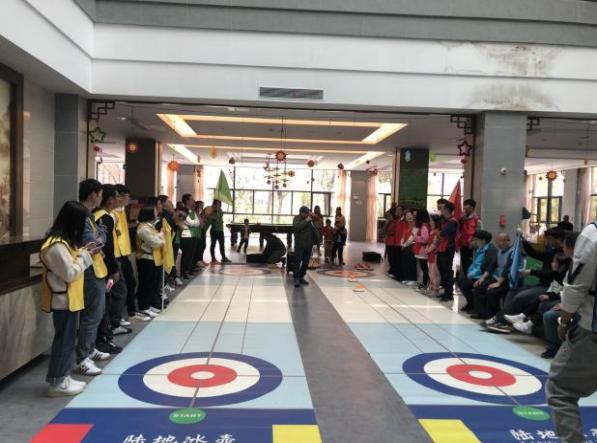 最后一個(gè)項(xiàng)目“旱地冰壺”,以小組為單位,在平滑的地面上進(jìn)行投擲的競賽項(xiàng)目。通過讓自己的壺停放在預(yù)設(shè)好的位置,或?qū)?duì)方球擊出,達(dá)到制勝的目的。這項(xiàng)競賽集智慧、戰(zhàn)術(shù)、判斷、技巧、把握時(shí)機(jī)的能力為一體,充分發(fā)揚(yáng)了雙方隊(duì)員誠實(shí)信任的體育精神。